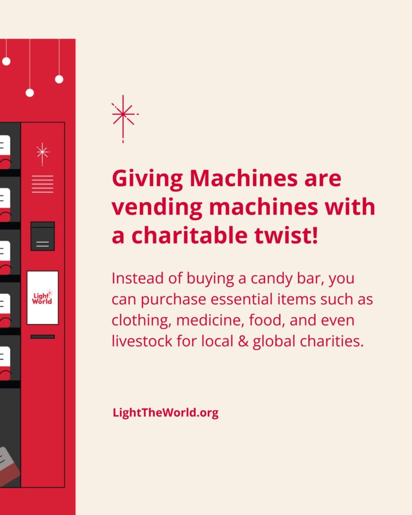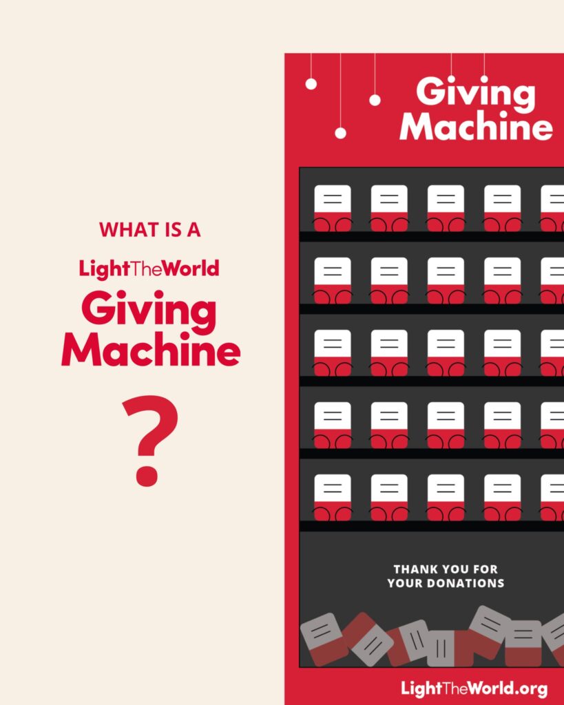 In 2017, the Giving Machine was born in response to a heartfelt question, “What if giving to someone in need was as easy as buying a snack from a vending machine?” The purpose of Light the World Giving Machines is to give anyone, no matter their age or means, the chance to actively participate in a giving experience.